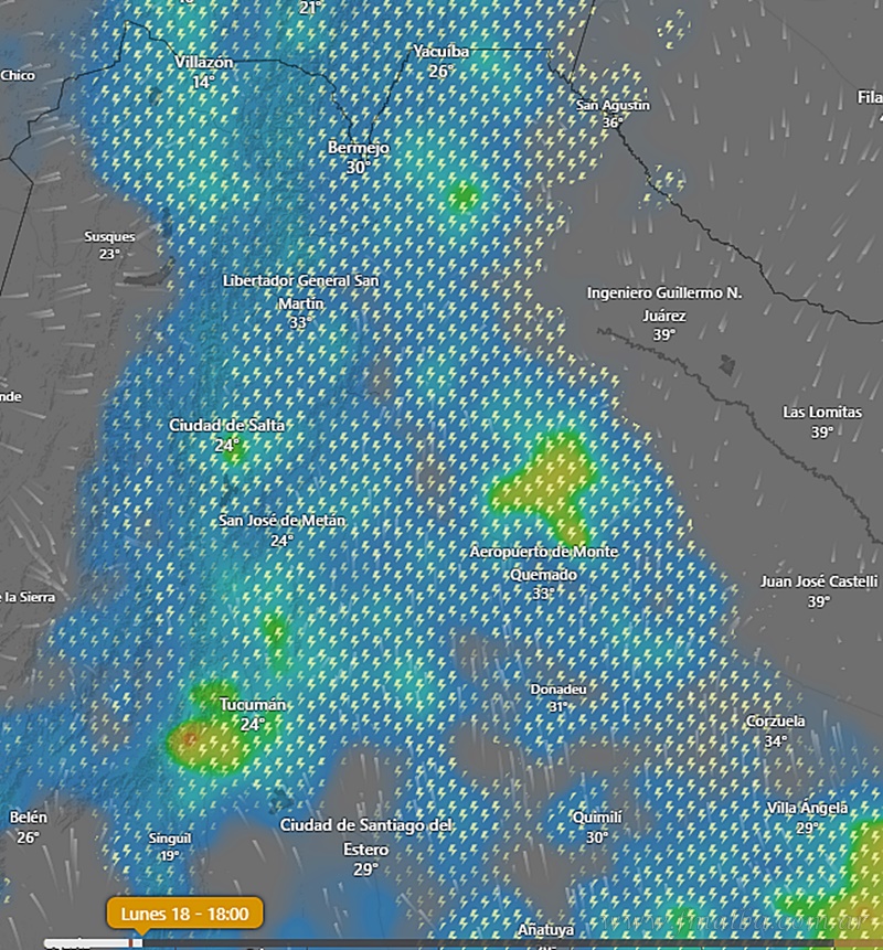 El informe del SMN resalta que gran parte de las regiones centro y norte del país continuará este lunes 18 con lluvias y precipitaciones, y agrega alertas amarillas por tormentas intensas para algunos sectores de la región NOA. La máxima esperada este lunes para Tartagal y zonas de alrededor eran 28 grados, pero hacia las 11 horas se superaba ese registro y cerrando el mediodía, las marcas se situaban en 34.2 grados, bajo térmica de 36.1 grados y cielo con nubosidad en aumento.