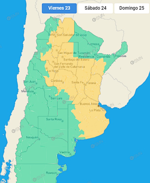 El avance lento del frente frío hacia el norte del país mantiene a buena parte del país bajo alerta amarilla por tormentas intensas. Hacia el mediodía, Buenos Aires, Catamarca, Chaco, Córdoba, Corrientes, Entre Ríos, Formosa, Jujuy, La Rioja, Salta, San Luis, Santa Fe, Santiago del Estero y Tucumán estaban bajo aviso. A ello se sumaba que Buenos Aires, Entre Ríos, Córdoba y Santiago habían recibido avisos a corto plazo.
