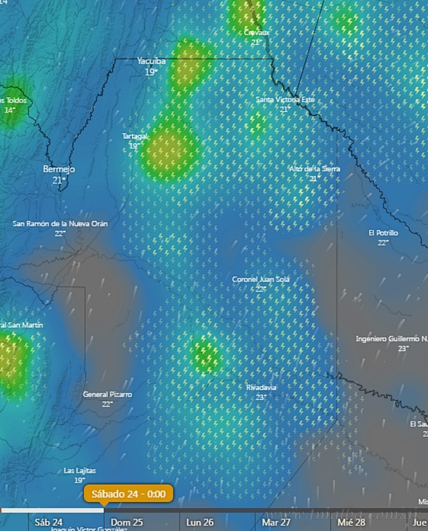 El Servicio Meteológico emitió ayer jueves por la noche alerta amarilla por tormenta intensa para los departamentos San Martín, Orán, Iruya y Santa Victoria Oeste. El área, reza el texto, se verá afectada por tormentas de variada intensidad, ráfagas, ocasional caída de granizo, fuerte actividad eléctrica y abundante caída de agua en cortos períodos; estimándose valores de entre 20 y 40 mm de precipitación acumulada, pudiendo ser superados de forma localizada.