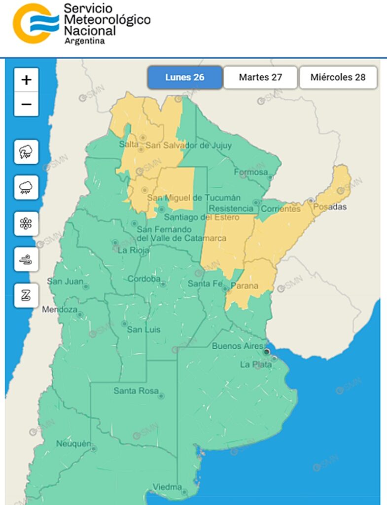 El Servicio Meteorológico Nacional volvió a emitir un informe de alerta amarilla por tormentas fuertes que extienden sobre el área centro y este de las provincias de Salta y Jujuy, norte de Santiago del Estero y Tucumán. Se espera la formación de lluvias y tormentas que pueden ser localmente fuertes hacia la noche de este lunes 26 y madrugada del martes 27; estimando valores de precipitación acumulada de entre 30 a 70 mm.