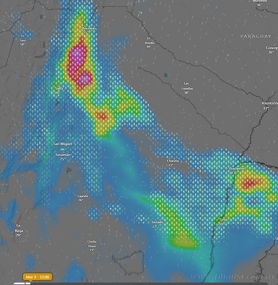 El Servicio Meteorológico Nacional emitió alertas naranjas y amarillas por tormentas fuertes para una gran porción del centro y nor-noroeste argentino. Exceptuando la porción extrema del oeste salteño, el corredor central de la provincia, incluyendo el departamento San Martín, se ve afectado ante la posibilidad de tormentas cercanas a los 70 mm de agua y ráfagas de hasta 90 km/h.