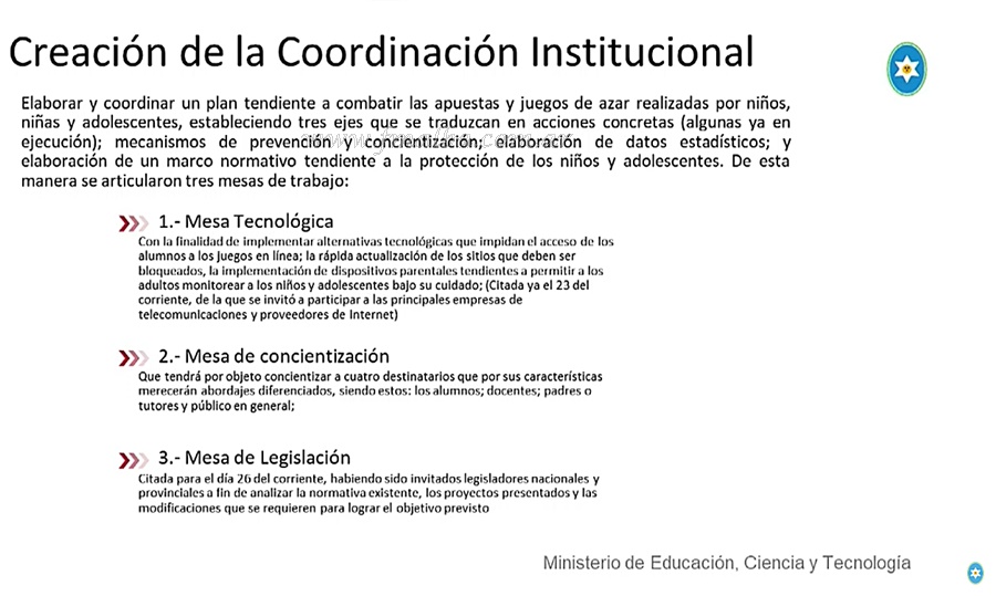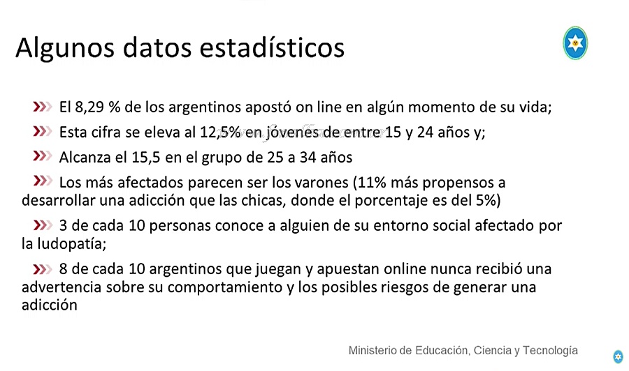 La ministra de Educación, Cristina Fiore Viñuales, presentó datos obtenidos del trabajo de la Mesa Intersectorial; entre ellos el cambio en el perfil del jugador, que bajó de 45 a 15 años, y el acceso a billeteras virtuales, desde los 12/13 años. Estadísticamente, el 8.29 por ciento de los argentinos apostó alguna vez online, cifra que suba a 12.5 por ciento en jóvenes de entre 15 y 24 años, siendo los más afectados los varones.