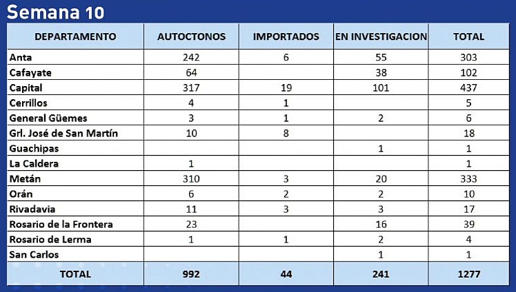 Comenzando el mes, la provincia notificaba 813 casos de dengue, y en datos actualizados al 4 de marzo, la cifra aumentó a 1.277; de los cuales 44 casos son importados, 992 autóctonos y 241 se encuentran en investigación para determinar el origen (sospechosos), hizo saber el Ministerio de Salud Pública. Los departamentos más afectados son Capital (437), Metán (333), Anta (303) y Cafayate (102). En Rosario de la Frontera se notificaban 39 casos en total, mientras que el resto de la distritos afectados infromaban menos de 20 (San Martín: 18).