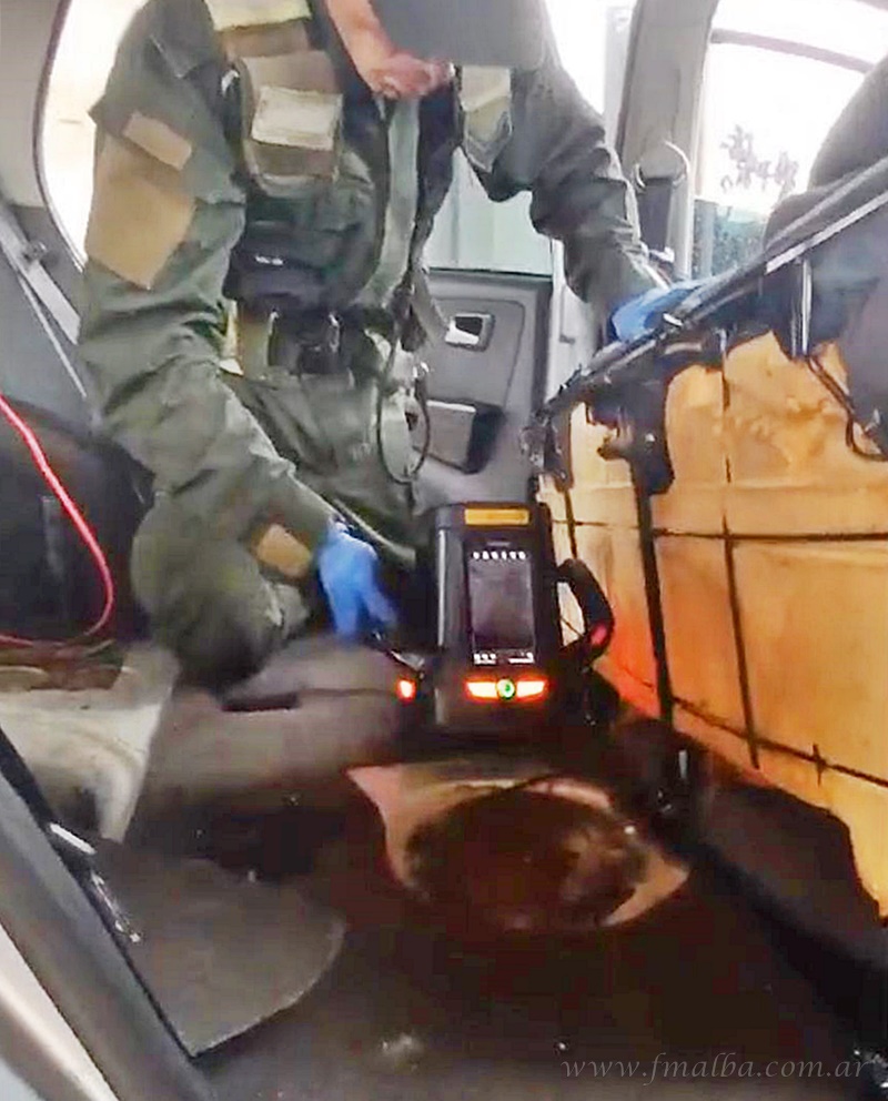 Ante el comportamiento del animal, se ppasó a un control más riguroso, usando el escáner móvil de la fuerza. Las imágenes evidenciaron la presencia de cuerpos extraños en el área. Posteriormente, del tanque se extrajeron 15 paquetes rectangulares envueltos en papel film y látex de distintos colores; que a las pruebas de campo Narcotest arrojaron resultado positivo para “clorhidrato de cocaína”, de un peso total de 17 kilos 85 gramos.