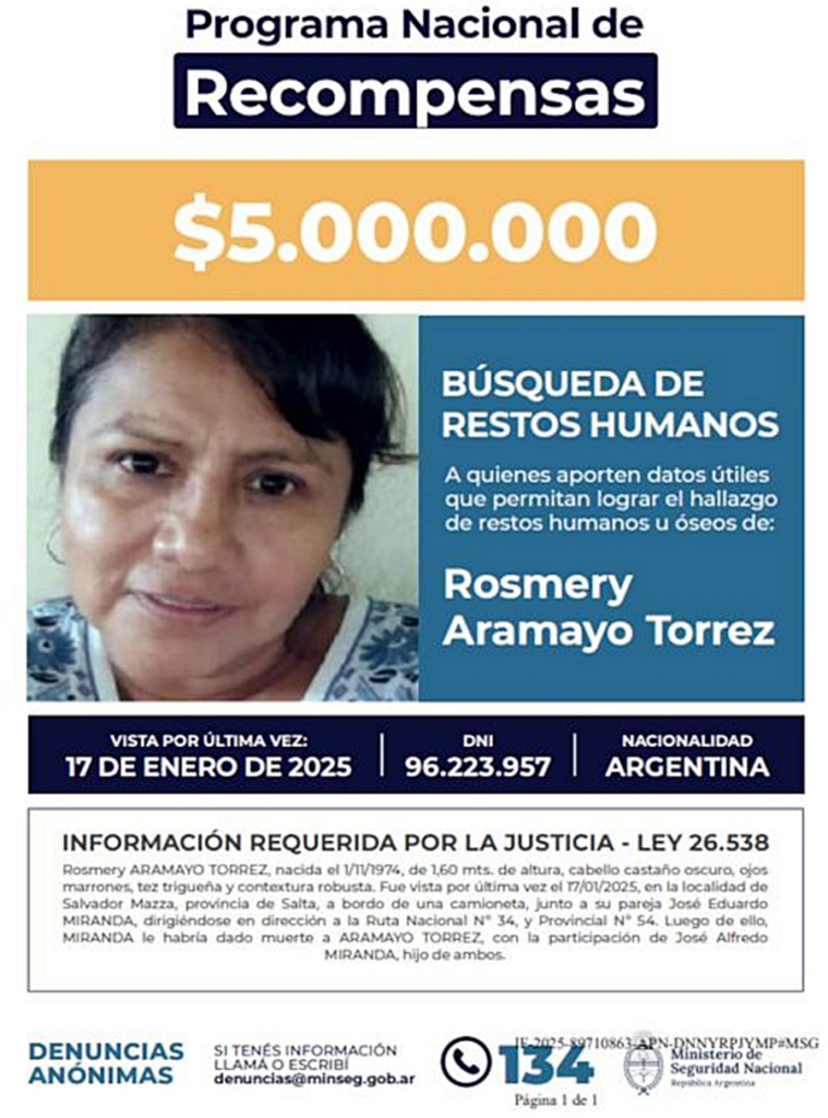 En un reciente esfuerzo por dar con información sobre el caso, la Unidad Fiscal (creada por resolución 1597/25) ofreció una recompensa de 5 millones de pesos para quien pueda aportar datos ciertos y útiles que permita dar con el paradero o encontrar los restos de Rosmery Aramayo Torrez. La Unidad Fiscal está intergrada por los fiscales penales Gonzalo Ariel Vega, Pablo Cabot y Rafael José Medina. Los fondos para la recompensa fueron gestionados ante el Ministerio de Seguridad Nacional (Resolución 1106/2025), exceptuando a quienes hubieran intervenido en el delito.
