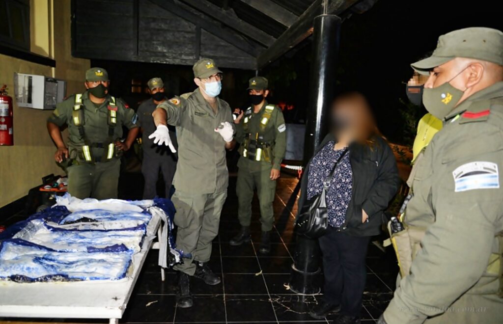 Inmediatamente, los gendarmes realizaron la apertura de las pertenencias de uno de los pasajeros, un ciudadano de nacionalidad peruana, y hallaron dentro de las mochilas que poseían falsas costuras creando una especie de doble fondo, envoltorios transparentes con una sustancia pulverulenta en su interior.