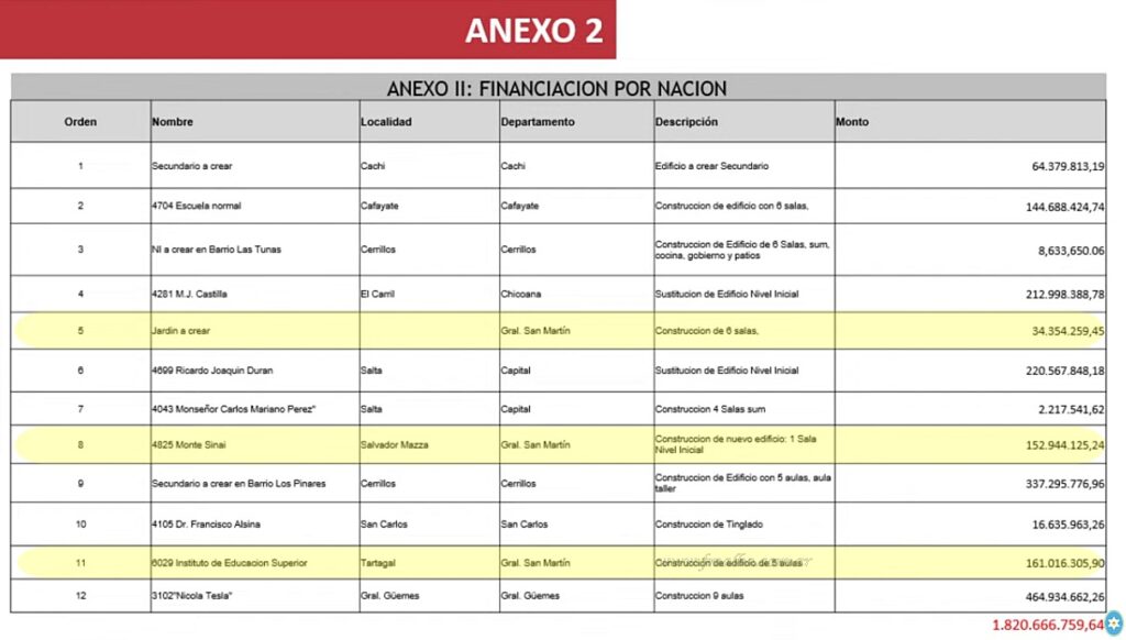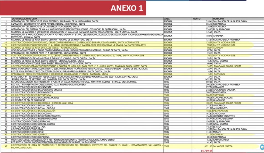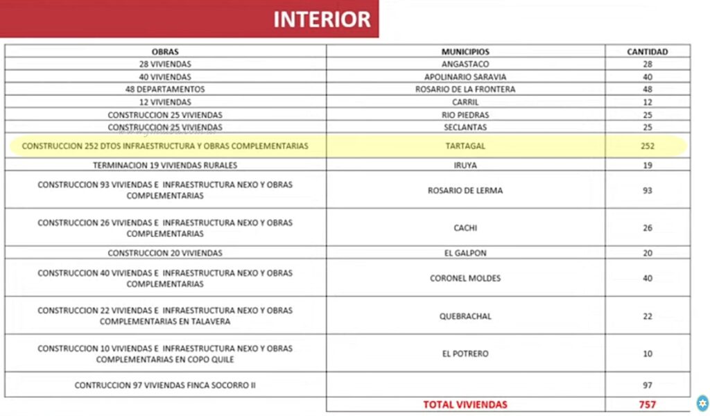 Puntualmente para Tartagal, incluye: construcción de CDI (Centro de Desarrollo Infantil), optimización de redes distribuidoras y conexión domiciliaria 1° etapa; contrucción de 252 departamentos y complementarias, y la contrucción de 5 aulas para el Instituto de Educación Superior, contando esta última con un monto de 161.016.305,90 pesos. Para el departemanto San Martín en general, se trata de 15 proyecto (incluyendo la construcción de 15 salas a definir localidad) con un presupuesto que ronda los 300 millones de pesos. En la firma participaron Lisandro Catalán (vicejefe de Gabinete del Interior), Javier Milano (secretario de Provincias y Municipios), Luis Giovine (secretario de Obras Públicas), María Inés Borgin Alba (subsecretaria de Gestión Administrativa Secretaría de Educación), Bartolomé Heredia (titular del ENOHSA), Rodrigo Aybar (secretario de Desarrollo Territorial, Hábitat y Vivienda), Santiago Sánchez Sorondo (subsecretario de Hábitat y Vivienda) y Sergio Camacho (ministro de Infraestructura de Salta).