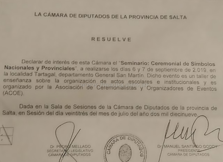 La Cámara de Diputados de Salta declaró “De Interés” el seminario taller de Ceremonial de Símbolos Nacionales y Provinciales, organizado para el mes de Septiembre por la Asociación de Ceremonialistas y Organizadores de Eventos; ACOE; que preside la ceremonialista Lila Antequera en Tartagal.