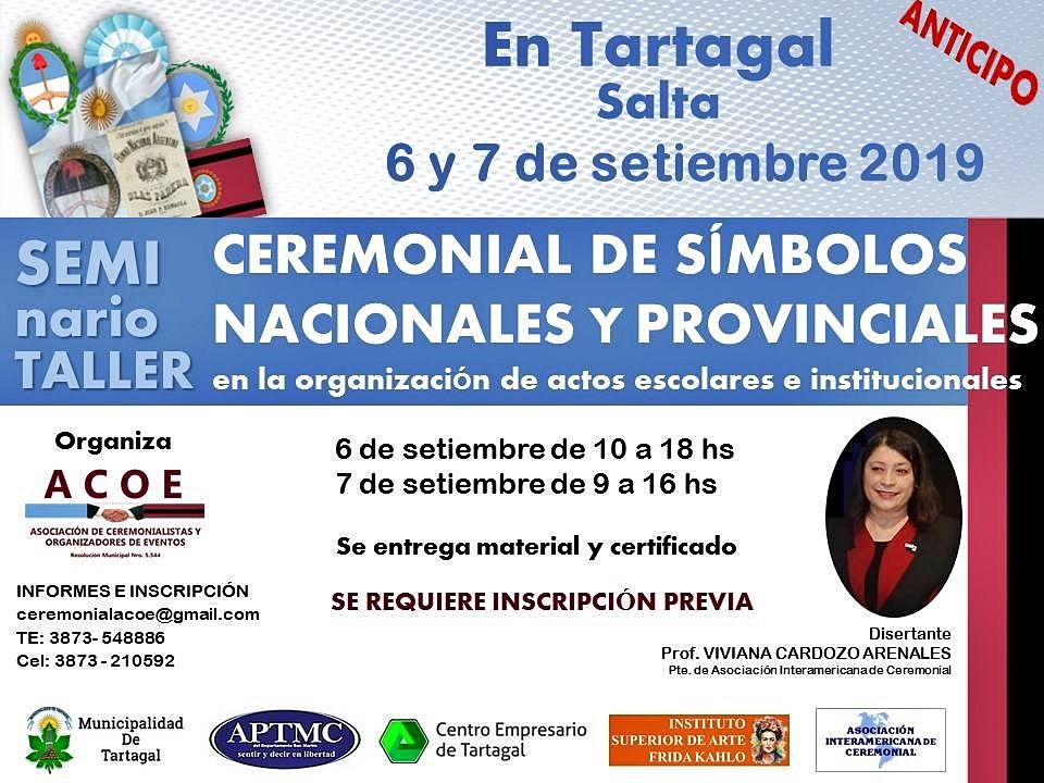 El 6 y 7 de Septiembre estará en Tartagal impartiendo la capacitación orientado sobre todo a educadores de todos los niveles, personal administrativo en instituciones públicas y privadas, encargados de organización de actos y protocolo, asesores y directores, y público en general.