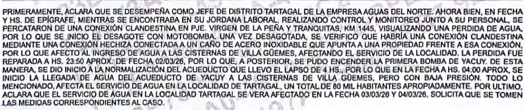 >>Denuncia radicada por el gerente titular de Aguas del Norte en Tartagal (Imagen: gentileza)