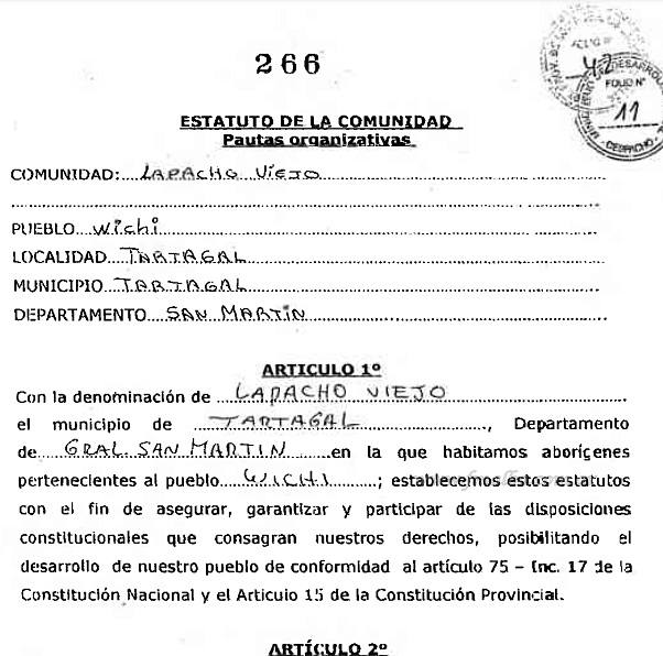 En el artículo 1 del texto de resolución se expone la aprobación al Estatuto Social y detalla que “disponer la inscripción de la personería jurídica de la Comunidad Indígena Lapacho Viejo, (Tartagal – Departamento San Martín), en el Registro de Comunidades Indígenas de la Subsecretaría de Regularización Territorial y Registro de Comunidades Indígenas, dependiente de la Secretaría de Asuntos Indígenas y Desarrollo Comunitario, en jurisdicción del Ministerio de Desarrollo Social”.