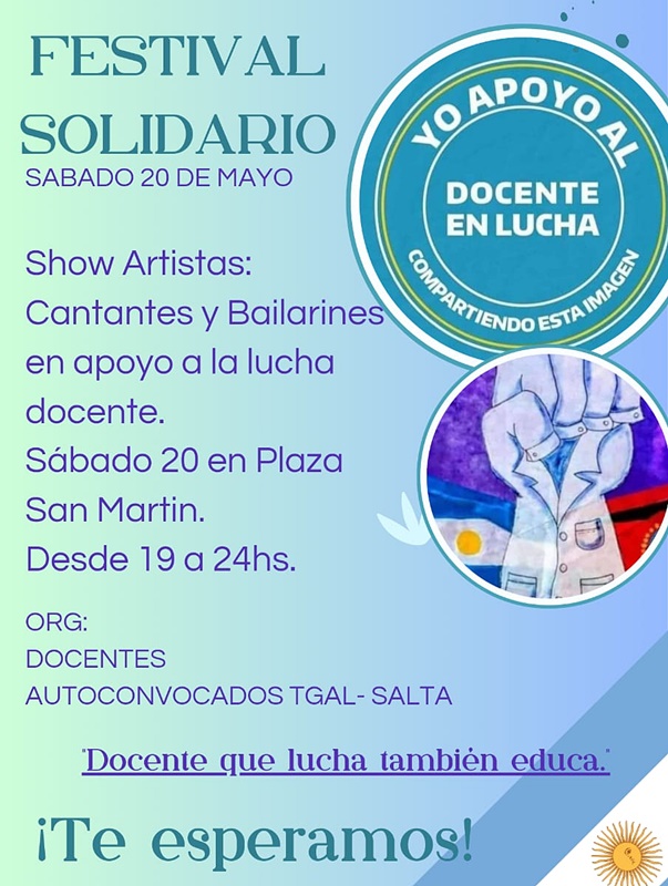 Para este viernes 19 se tenía programado efectuar una asamblea docente departamental en General Mosconi a las 15 horas; en tanto que mañana sábado 20 se efectuará un Festival Solidario en apoyo a los educadores (confirmada la presencia de ballets y artistas), el cual se desarrollará en Plaza San Martín al caer la tarde, desde las 19 horas y extendiéndose hasta las 00, informó la delegada docente María Irades.
