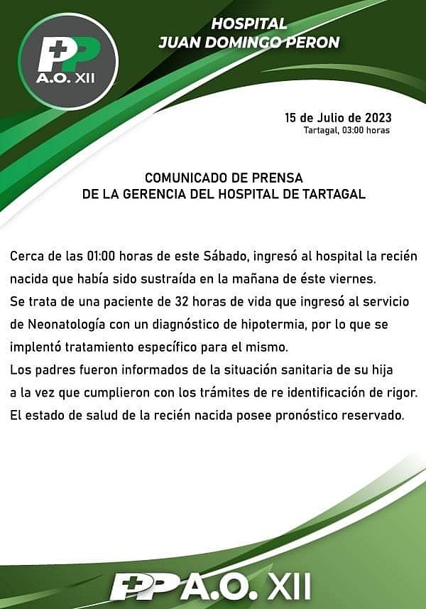 Tras un primer parte médico emitido (imagen), uno más reciente; dado a conocer antes del mediodía por la gerencia del Hospital Zonal; informaba que el estado de salud de la recién nacida es bueno: “La niña se encuentra internada en el servicio de neonatología, su estado de salud es estable y evoluciona favorablemente del cuadro de hipotermia con el que ingresó y en espera de los resultados bacteriológicos de rutina“.