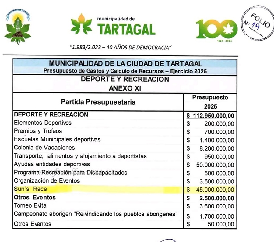 La pasada semana se presentó oficialmente el calendario del Sun’s Race para este 2025 como así también el reglamento para la 28° Edición. Paralelamente, se recordó que el presupuesto destinado para el evento; el más convocante para el norte salteño; asciende a 45 millones de pesos, de un total de casi 113 millones (112.950.000 pesos) asentado para el área de Deportes y Recreación de Tartagal.