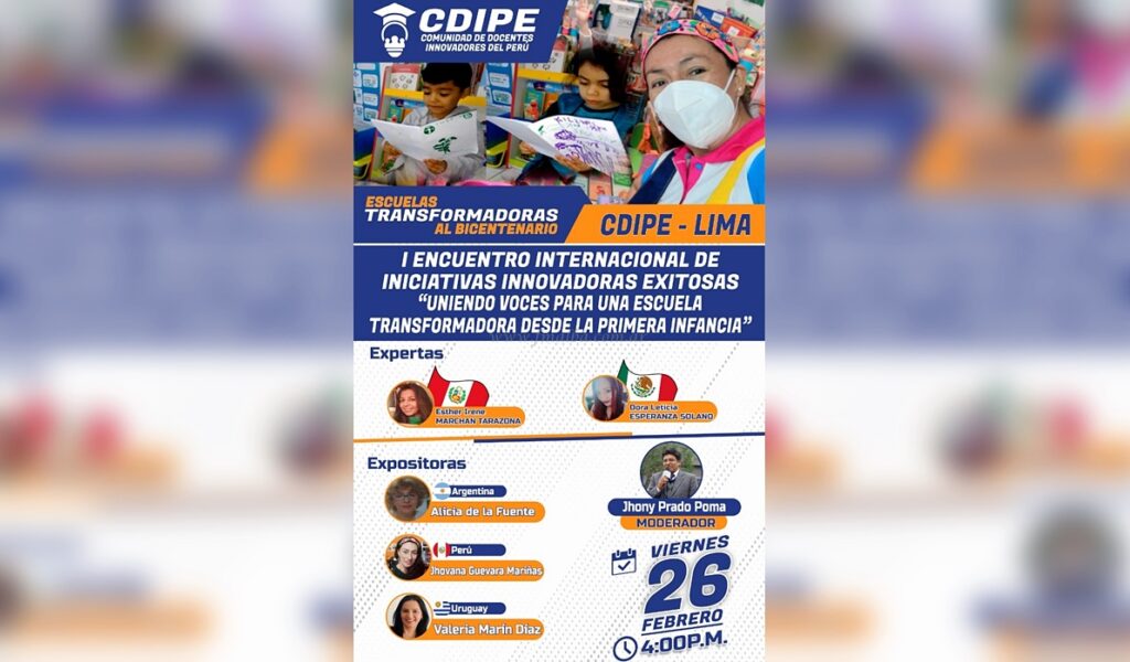 El “I Encuentro Internacional de Iniciativas Innovadoras Exitosas – Uniendo voces para una Escuela Transformadora desde la Primera Infancia” reúne este 2021 a docentes de Perú (país anfitrión), México, Uruguay y Argentina. Por nuestro país, la docente tartagalense será una de las expositoras y compartirá panel con Jhovana Guevara Mariñas (Perú) y Valeria Marín Díaz (Uruguay), bajo la moderación de Jhony Prado Poma.