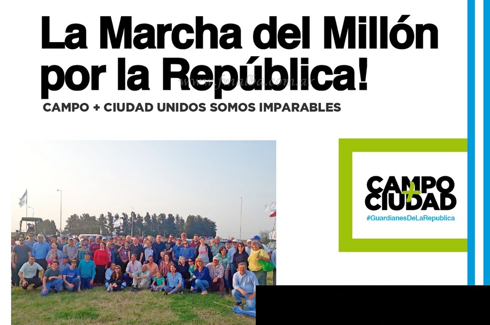 La convocatoria se fijó para las 15 horas de este sábado 19 y tiene por lema “Campo+Ciudad”; con la consigna es “en apoyo a la República, la Justicia y la libertad”, si bien no está del todo claro cuál es la figura u agrupación que organiza la Marcha.