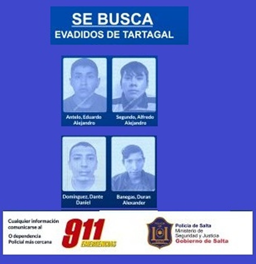 Todo el grupo es oriundo de Tartagal y purgaba condenas por delitos contra la propiedad. La fuga ocurrió el lunes por la tarde, luego que limaran barrotes de la celda y escaparan de la dependencia saltando la tapia; momento a partir del cual se desplegó un importante operativo con el Distrito de Prevención 4 en conjunto con áreas investigativas y operativas de Capital.