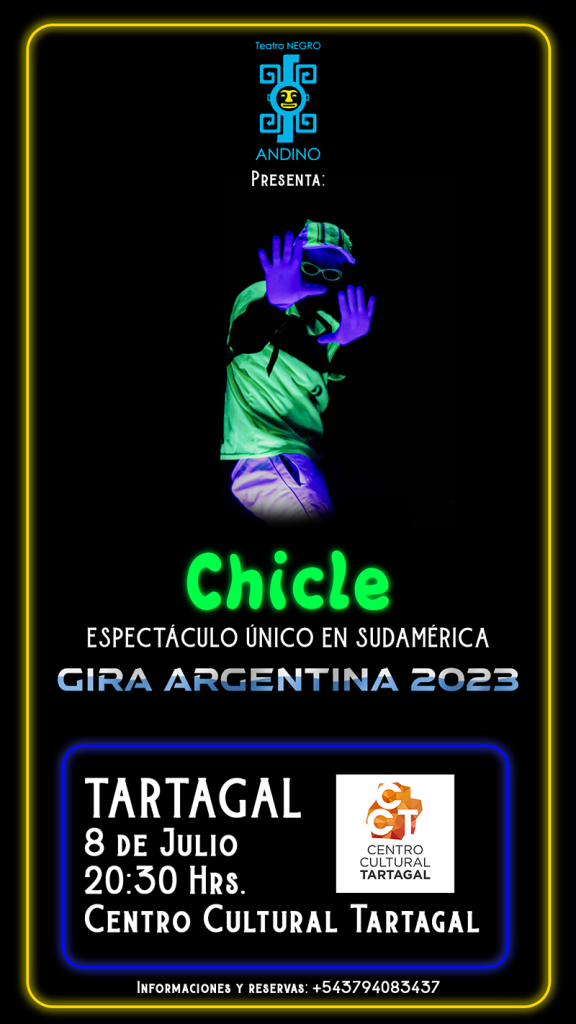 El sábado 8 de julio, en el Centro Cultural Tartagal, se presentará la obra “Chicle & Magic”; de la compañía boliviana “Teatro Negro Andino”; en su gira por Argentina. La compañía es la única en Sudamérica dedicada a este tipo de puesta en escena para todo público. Las entradas pueden conseguirse anticipadas.