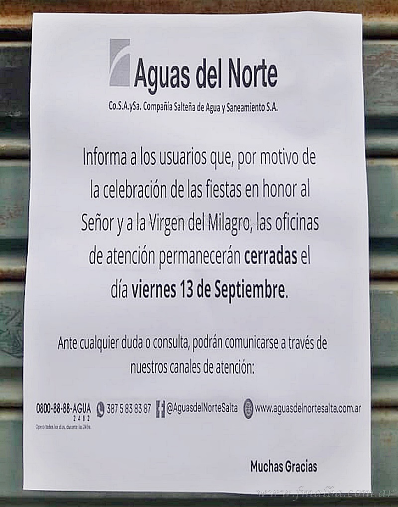 La oficina de Aguas del Norte, Registro Civil y la Municipalidad no atenderán al público este viernes 13 de septiembre; y en el caso de la Municipalidad, por resolución 27.044/24, el lunes 16 también fue decretado “día no laborable” para la administración pública local. El Hospital Zonal comunicó que dispondrán de guardias para atención de emergencias y eventualidades.
