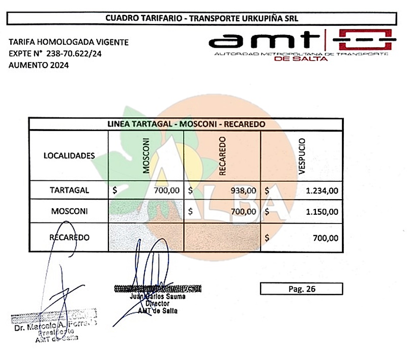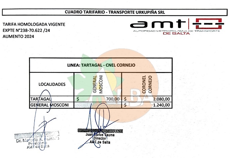 La Autoridad Metropolitana de Transporte de Salta publicó el cuadro tarifario para el servcio interurbano en el interior provincial. Las empresas habían anunciado que desde el 7 de marzo comienzan a regir los nuevos valores, que deberán ser acatados sin ninguna diferencia. Para los usuarios del departamento, viajar desde Tartagal a Salvador Mazza insumirá poco más de 4.500 pesos y hacia Campamento Vespucio, más de 1.200 pesos.