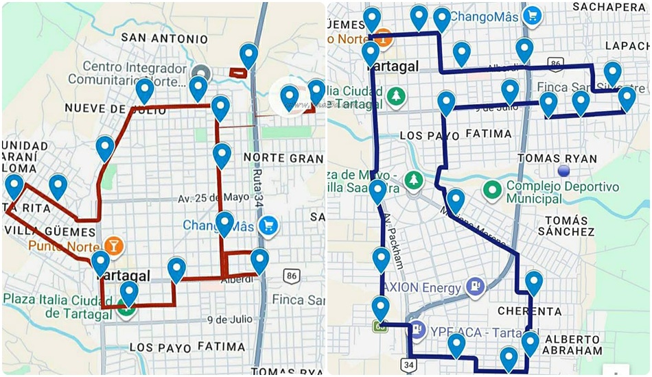– Transversal Norte: el recorrido comienza en Avenida Alberdi y continúa por Avenida 24 de Septiembre, Avenida Dorrego, Ruta Nacional 34, Avenida 17 de Junio, Raúl Alfonsín, Ernesto Sábato, Dr. Favaloro, Avenida 17 de Junio, Ruta Nacional 34, Acceso a B° Adolfo Güemes, 3° Pasaje del B° Adolfo Güemes, Plazoleta B° Adolfo Güemes, Ruta Nacional 34, Avenida Dorrego, Avenida 24 de Septiembre, Facundo Quiroga, Avenida 20 de Febrero, Lavalle, Las Heras, Los Nogales, Salta, Avenida 20 de Febrero, Bolivia, Aráoz, Avenida Alberdi, Avenida 24 de Septiembre, España, Ruta Nacional 34 y Avenida Alberdi.