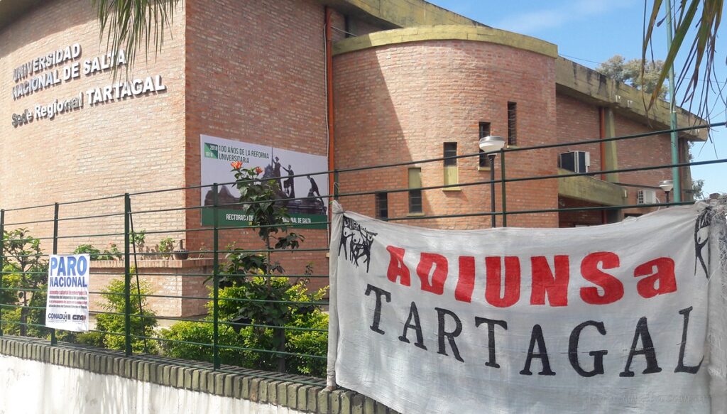 Profesores universitarios y pre universitarios de la Sede Regional Tartagal de la UNSa nucleados bajo Adiunsa iniciaron hoy miércoles un paro de 48 horas, tanto en modalidad presencial como virtual. La nueva convocatoria a paro se debe a la falta de respuestas de Nación a las demandas salariales del sector. Entre los puntos de dichas demandas figura el rechazo al 33 por ciento de aumento en ocho cuotas; hasta marzo de 2022; que acercó el gobierno nacional.