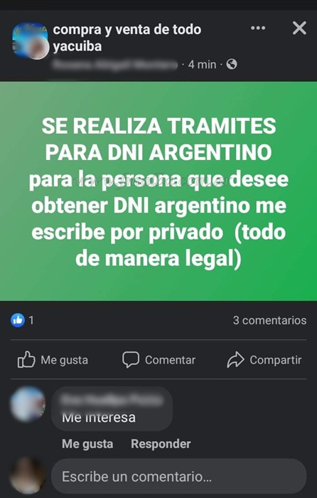 A la par de las aperturas, también surgieron ofertas cuestionables. En un grupo de compra-venta de Yacuiba (Bolivia) llamó la atención el texto que ofrece realizar “trámites para DNI Argentino para la persona que desee obtener” el documento argentino, garantizando; sin embargo; que la gestión es “legal”.